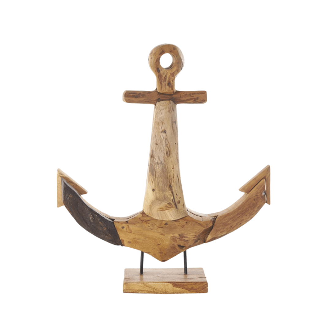 Carved from rich teak wood, this anchor-shaped decorative piece brings timeless nautical charm and natural warmth to any space. Its smooth finish and coastal silhouette evoke sunlit harbors and driftwood shores—perfect for styling entryways, shelves, or beach-inspired vignettes with relaxed sophistication.